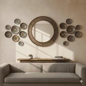 Mirrors reflect light and make small living rooms feel larger. Combine them with decorative wall plates on either side for balance. This combo is trending in Indian homes because it blends art + utility.