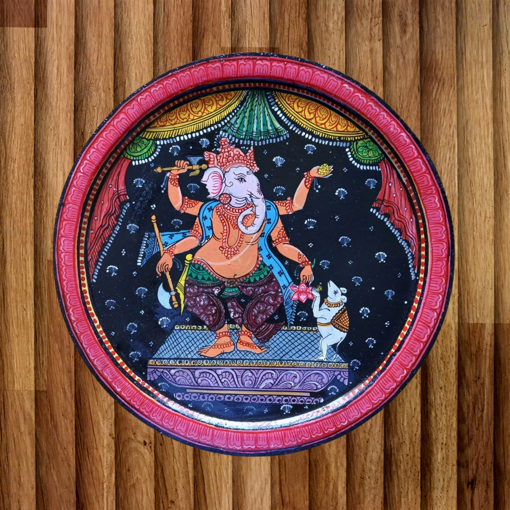 The image depicts Lord Ganesha in a standing pose, adorned with vibrant colors like blue, green, orange, and gold, against a black background with intricate red and gold patterns. In Vastu Shastra, such images are believed to bring prosperity, wisdom, and remove obstacles, ideally placed near the entrance to invite positive energy. This heritage artwork reflects Indian culture and Hinduism, where Lord Ganesha is revered as the remover of obstacles and the god of beginnings. The intricate design showcases rich artistic heritage, symbolizing wisdom and understanding necessary for life’s perfection.