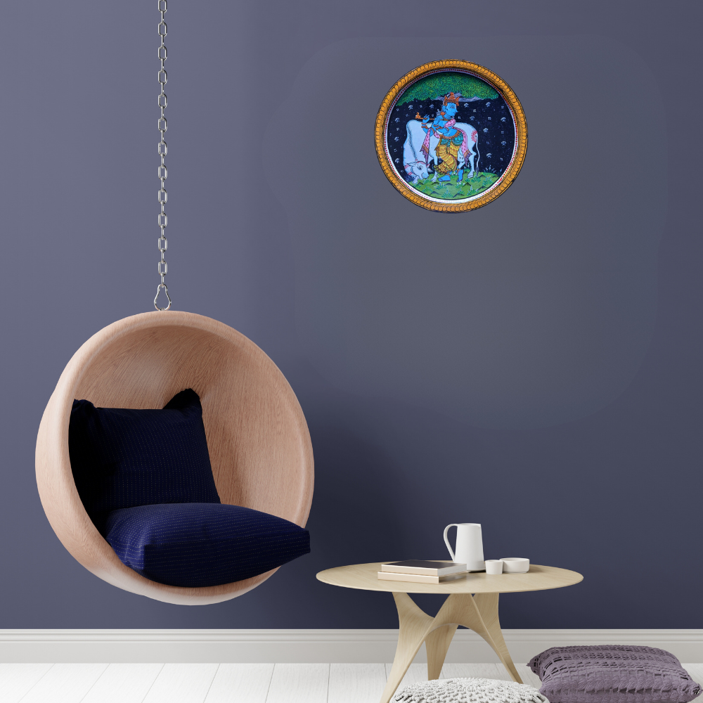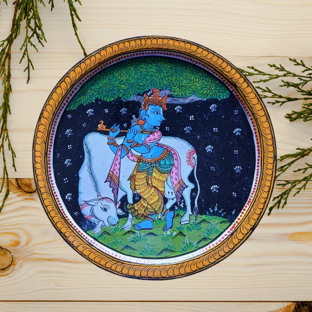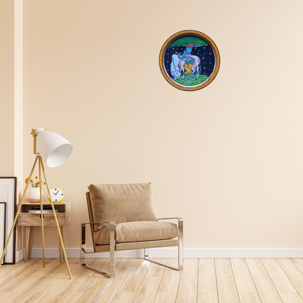 The image depicts Lord Krishna playing a flute beside a cow, with vibrant colors including Krishna’s blue skin, yellow and pink garments, and a white cow adorned in pink and green. The serene background of a starry night and lush green foliage is enclosed by a golden border. In Vastu Shastra, Krishna with a cow symbolizes peace, prosperity, and harmony. This heritage artwork reflects Krishna’s deep cultural and spiritual significance, representing love, compassion, and divine joy. It captures traditional Indian art’s essence, enhancing any space with its profound meaning and heritage.