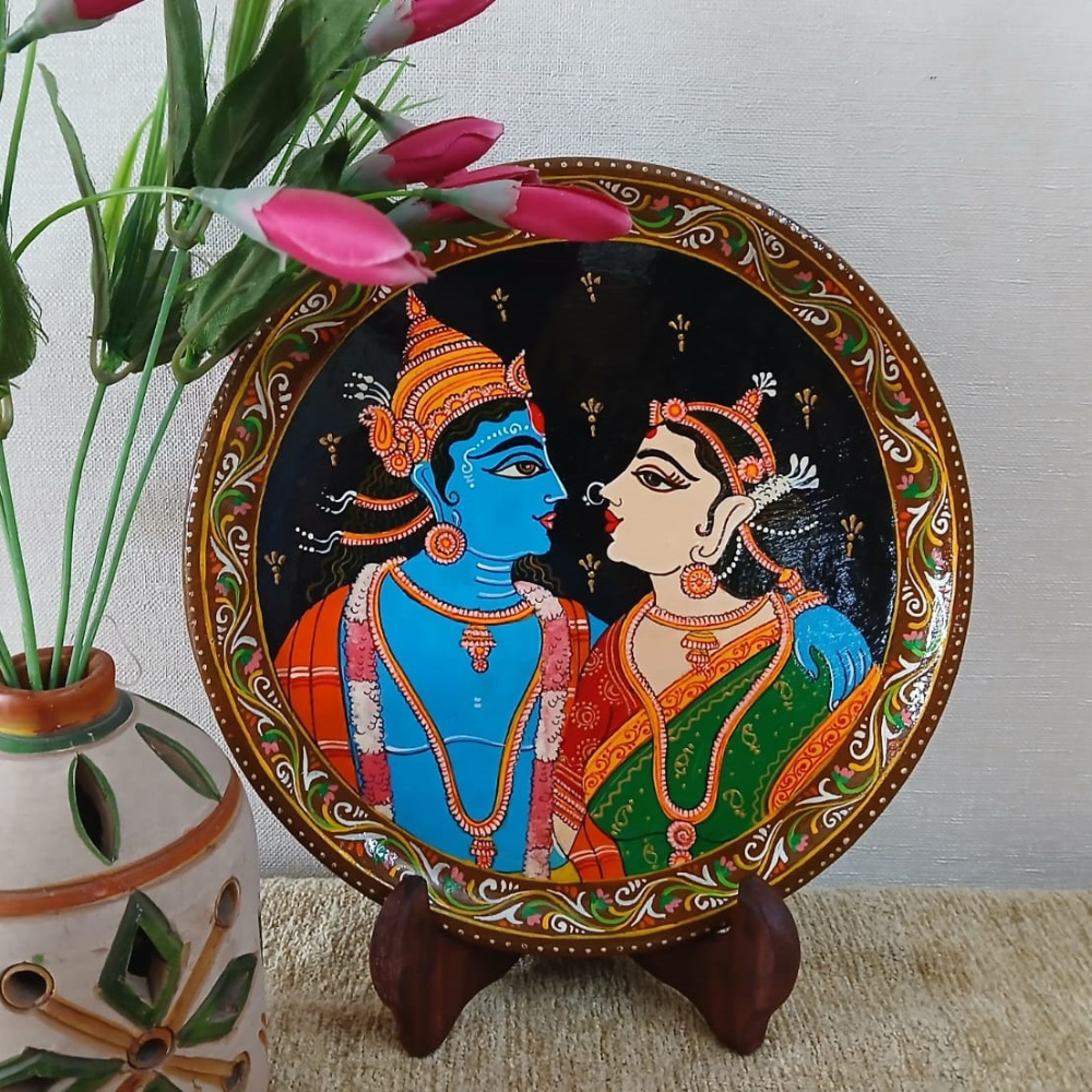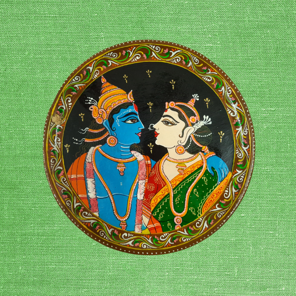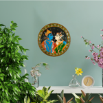The image depicts Radha and Krishna adorned in vibrant blue, orange, green, and red attire. The intricate border in this pattachitra features patterns in green, white, and red. In Vaastu Shastra, such images symbolize harmony and positive energy in the home. This heritage artwork reflects India’s rich cultural traditions and is often linked to divine or mythological themes, enhancing spiritual well-being. The figures, embodying love and devotion, illustrate the profound divine connection, making this piece a revered symbol in Indian art and culture. The painting infuses the space with vibrant colors and spiritual significance.