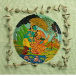 The image depicts a traditional Indian painting featuring Lord Krishna & Radha under an umbrella, surrounded by lush greenery, deer, and lotus flowers. The vibrant color combination includes shades of green, blue, yellow, and red, creating a visually appealing contrast. The painting holds Vaastu importance as it symbolizes love, protection, and harmony, which are believed to bring positive energy into a space. The heritage aspect is evident in the traditional attire and intricate detailing, reflecting Indian cultural and artistic traditions. The image conveys a sense of serenity and devotion, often associated with divine love and nature’s beauty. The surrounding eucalyptus leaves add a natural frame, enhancing the overall aesthetic.