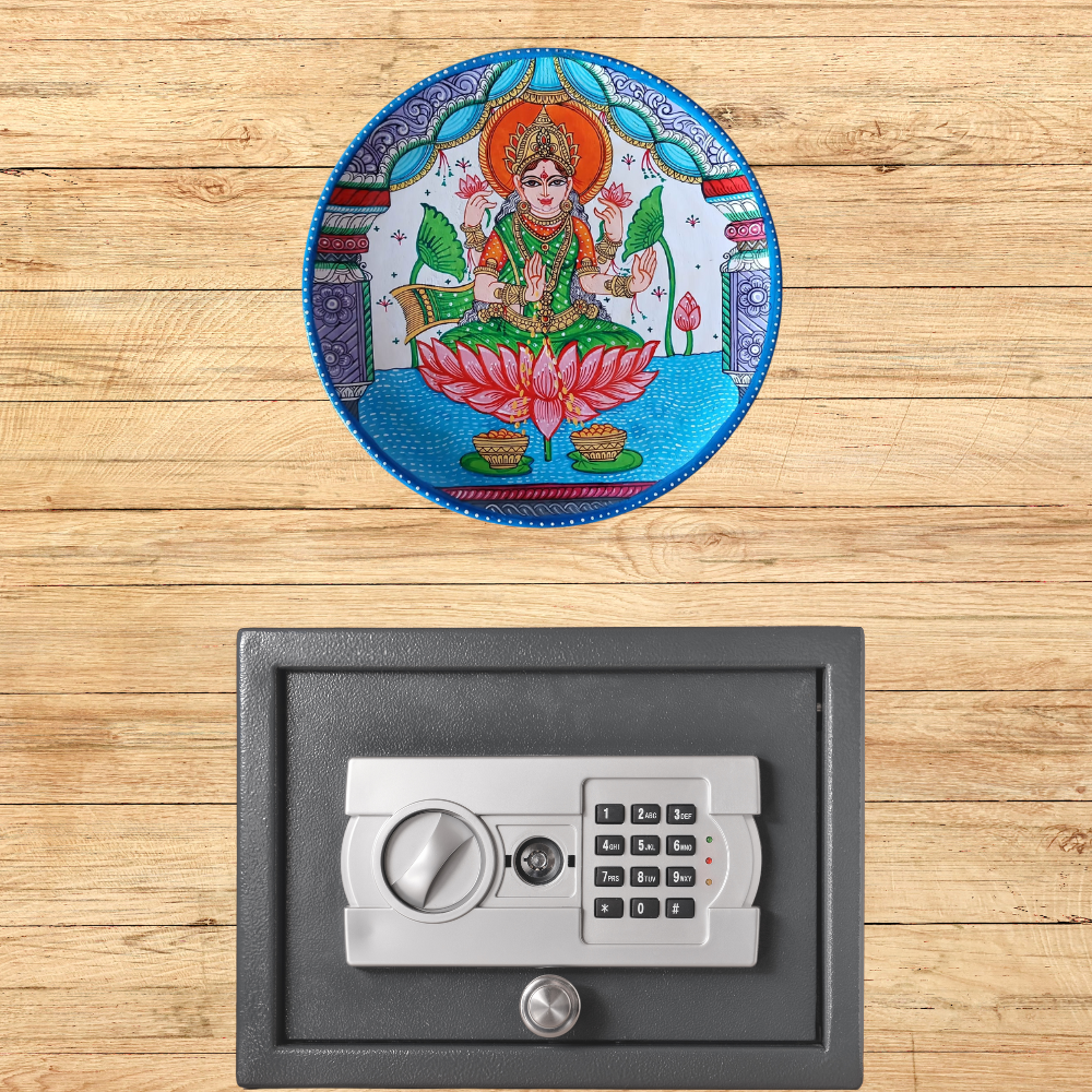 This painting of Goddess Lakshmi, seated on a blooming lotus, radiates prosperity and purity. Adorned with traditional jewelry and holding lotus flowers, she symbolizes wealth and spiritual power. She is revered as the goddess of wealth and prosperity, worshipped for financial stability and success. According to Vastu Shastra, placing her image in the north or northeast direction attracts positive energy and wealth. The image should face inside the house and be visible for worship. This painting not only enhances your space but also serves as a spiritual symbol of abundance.