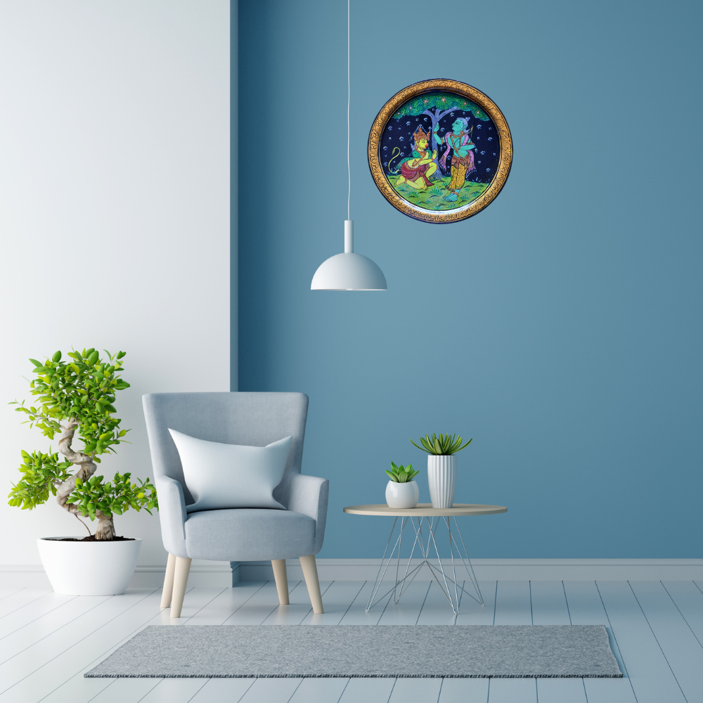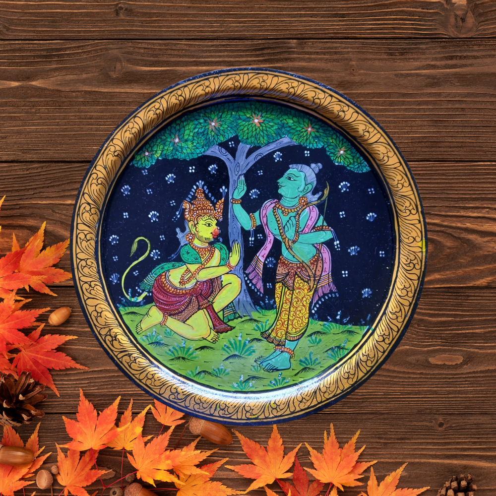The image depicts Hanuman taking blessings from Lord Rama, highlighting a scene from the Ramayana. Vibrant shades of red, blue, green, and gold dominate, with Lord Rama radiating a calm blue aura and Hanuman adorned in red and gold, symbolizing devotion and strength. This artwork, inspired by the Ramayana, embodies themes of devotion, loyalty, and righteousness. Hanuman seeking blessings symbolizes humility, devotion, and divine grace. It captures traditional Indian art, weaving cultural and spiritual narratives into a visually captivating piece that enhances any space with its profound meaning and heritage.