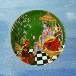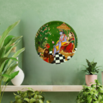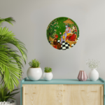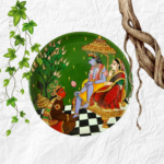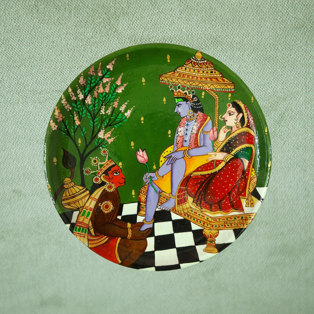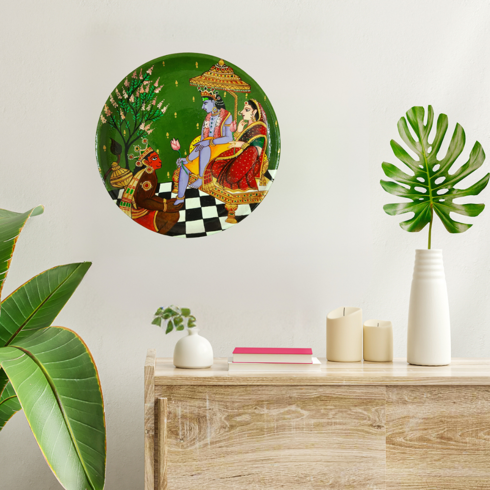 The image features Lord Ram seating on a throne under a decorated canopy, holding a lotus flower. Maa Sita in a red saree siting beside him, while bhakt Hanuman kneels in reverence. The vibrant colors green, blue, red, yellow, and black evoke prosperity and protection in Vaastu. This heritage piece symbolizes purity, enlightenment, and divine grace. The green backdrop with a flowering tree and black-and-white chequered floor adds to its traditional Indian art essence. The scene, possibly from Hindu mythology, illustrates devotion and spiritual harmony, enhancing the space’s ambiance with cultural and spiritual depth.